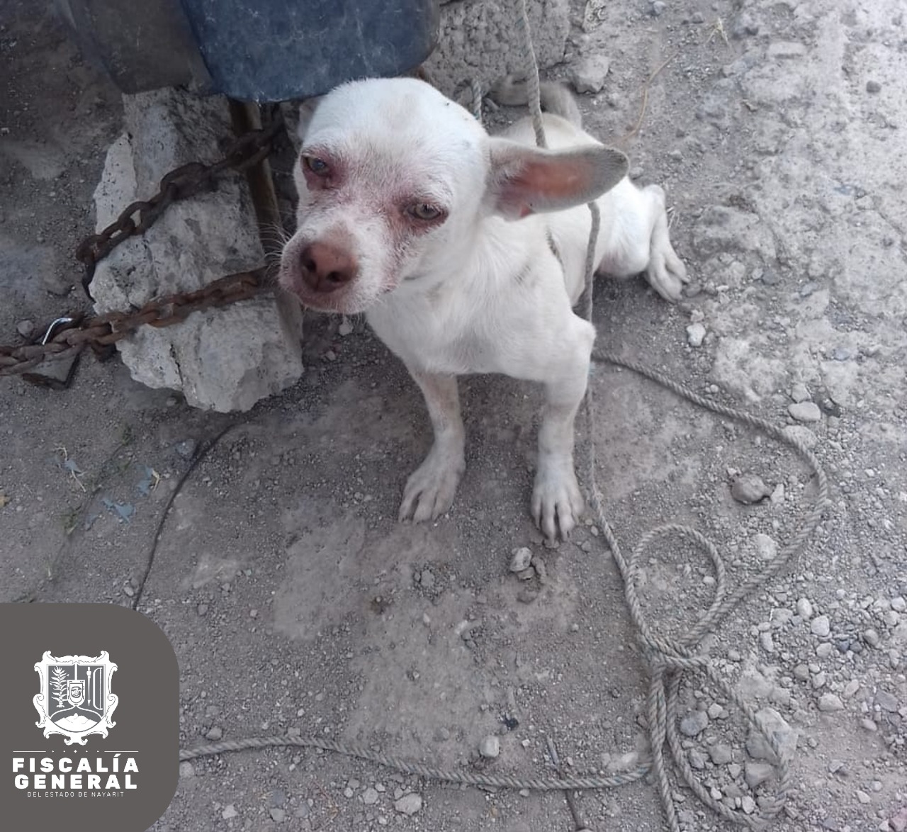 Se trata del aseguramiento de un canino raza criolla de aproximadamente 2 meses de edad, color blanco, el cual se encontraba en malas condiciones físicas, motivo por el cual se procedió a asegurar a dicho animal para trasladarlo al Centro de Atención Integral a Mascota (CAIM) de la ciudad de Tepic, donde permanecerá en resguardo provisional mientras continúa la investigación.