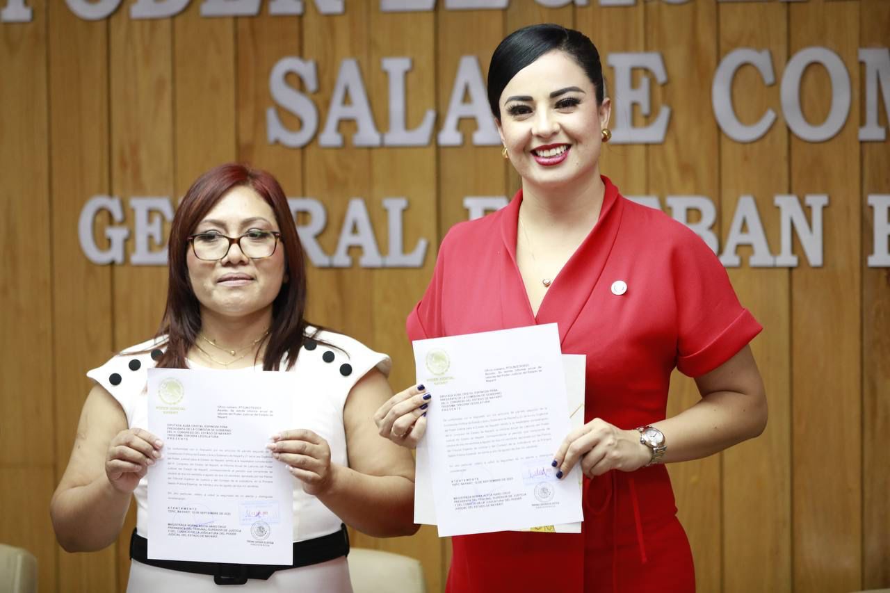 Tepic, 12 de septiembre de 2023.- Tal como lo señala el artículo 86 de la Constitución Política local y el artículo 21 de la Ley Orgánica del Poder Judicial, la presidenta del Congreso del Estado, diputada Alba Cristal Espinoza Peña, recibió de manos de la presidenta del Tribunal Superior de Justicia, magistrada