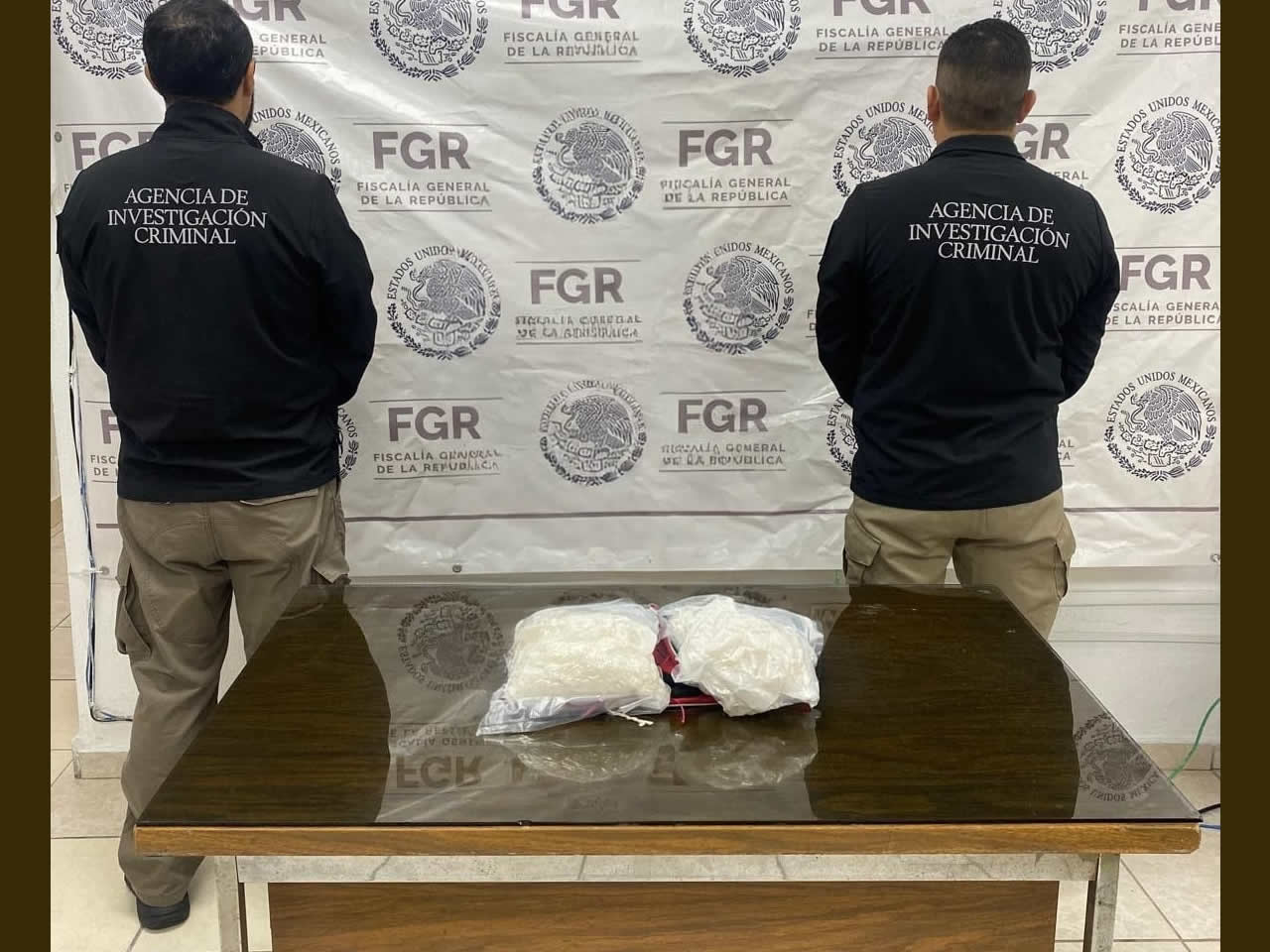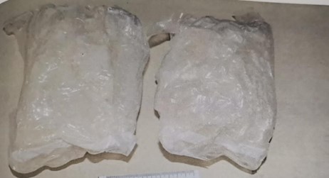 Al momento de la detención, se aseguró una maleta con dos paquetes de plástico que en su interior contenían una sustancia cristalina con las características de la metanfetamina con un peso aproximado de dos kilos 600 miligramos.