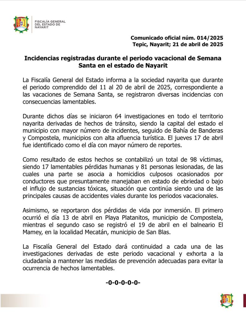 Tepic, Nayarit; 21 de abril de 2025.- La Fiscalía General del Estado informa a la sociedad nayarita que durante el periodo comprendido del 11 al 20 de abril de 2025, correspondiente a las vacaciones de Semana Santa, se registraron diversas incidencias con consecuencias lamentables.
