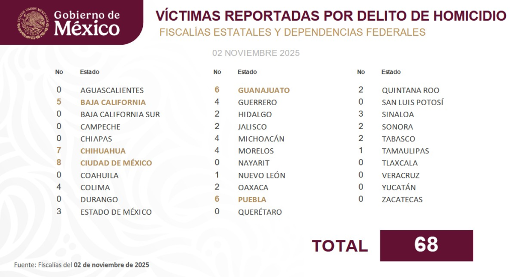 La SSPC detalló en su informe, “Víctimas reportadas por delito de homicidio”, los estados donde se reportaron la mayoría de asesinatos, el domingo 2 de noviembre: