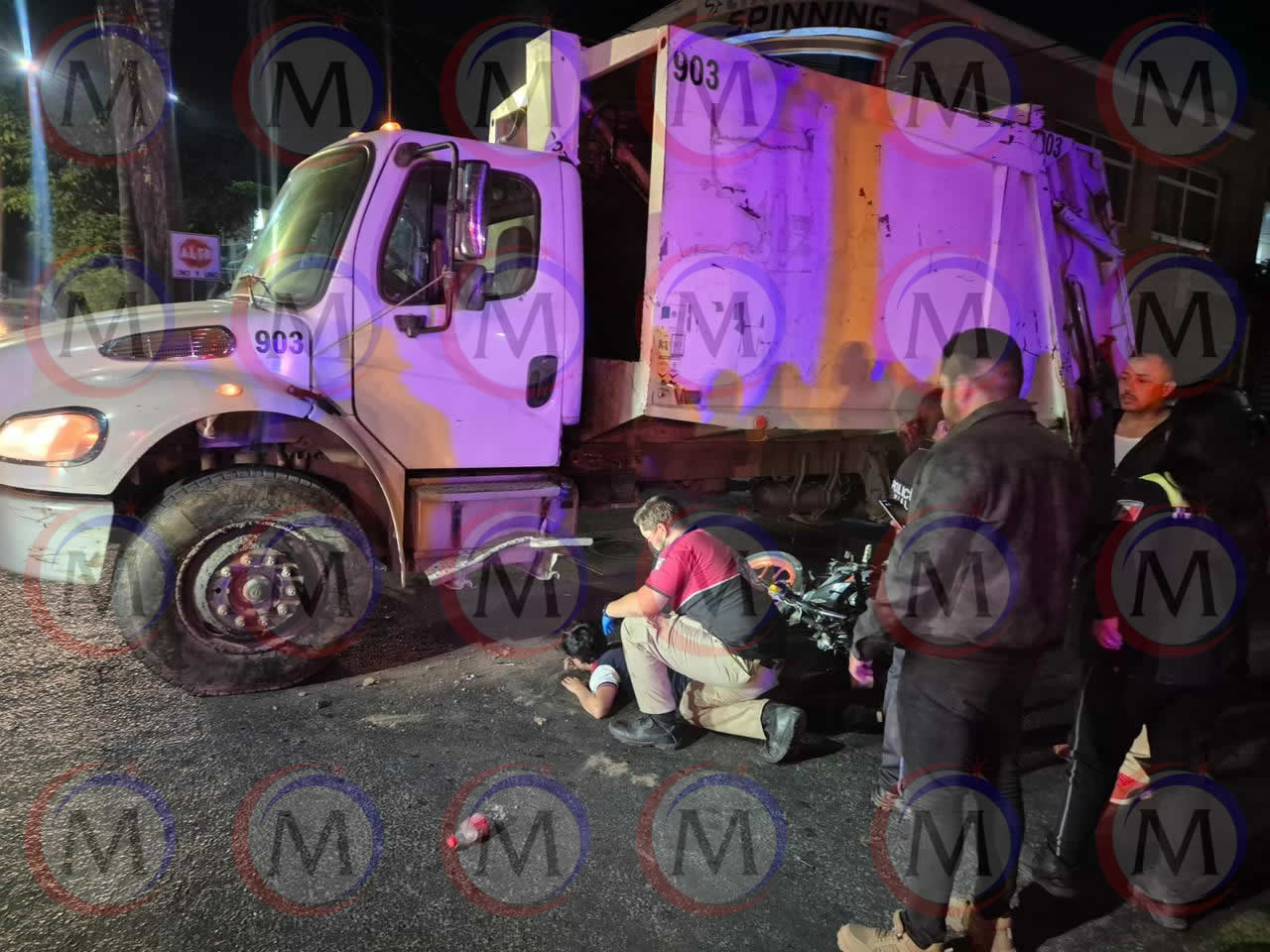 TEPIC.- La noche de este martes se registró un choque entre una motocicleta y un camión recolector de basura en el cruce de las calles Allende y Bucerías, en la Huerta Residencial.