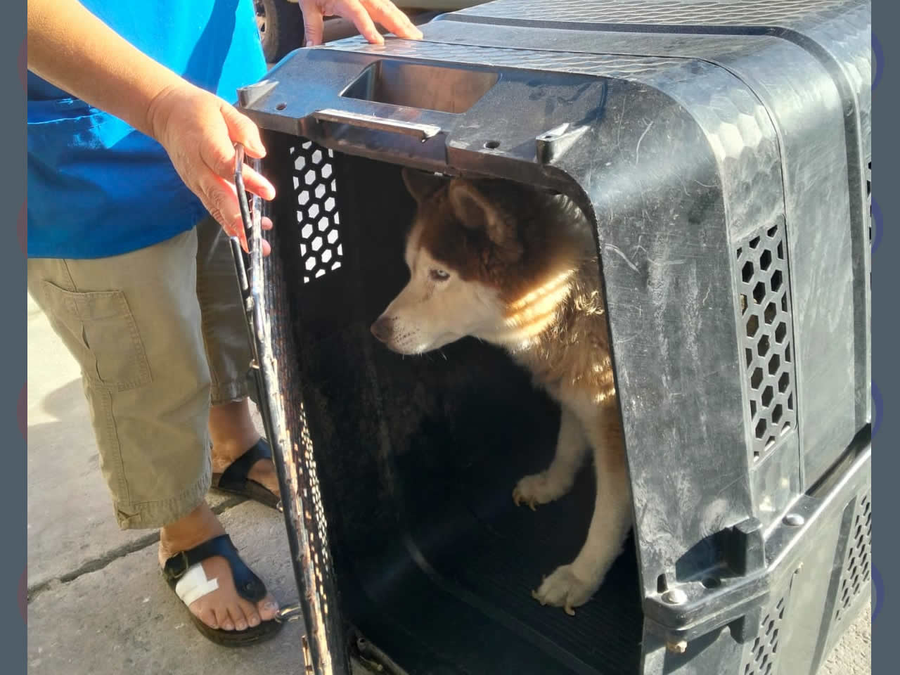 En respuesta a esta denuncia, los agentes de la Unidad Canina acudieron al numeral ubicado sobre la calle Zaragoza, donde una persona del sexo femenino, de 51 años de edad, informó tener una perrita rescatada, de la raza Husky, mismo que tenía la edad de siete años y que contaba con una condición que le ocasionaba pérdida de peso y de cabello, misma que hasta el momento no había sido tratada correctamente.