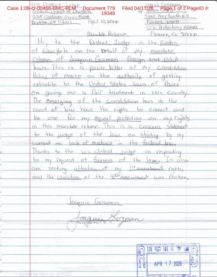 De acuerdo con los registros del sistema PACER (Public Access to Court Electronic Records), por sus siglas en inglés (Acceso público a los registros electrónicos del tribunal) el escrito fue recibido el 17 de abril de 2026 y está dirigido al juez de distrito en Brooklyn, Nueva York, donde el narcotraficante fue procesado.