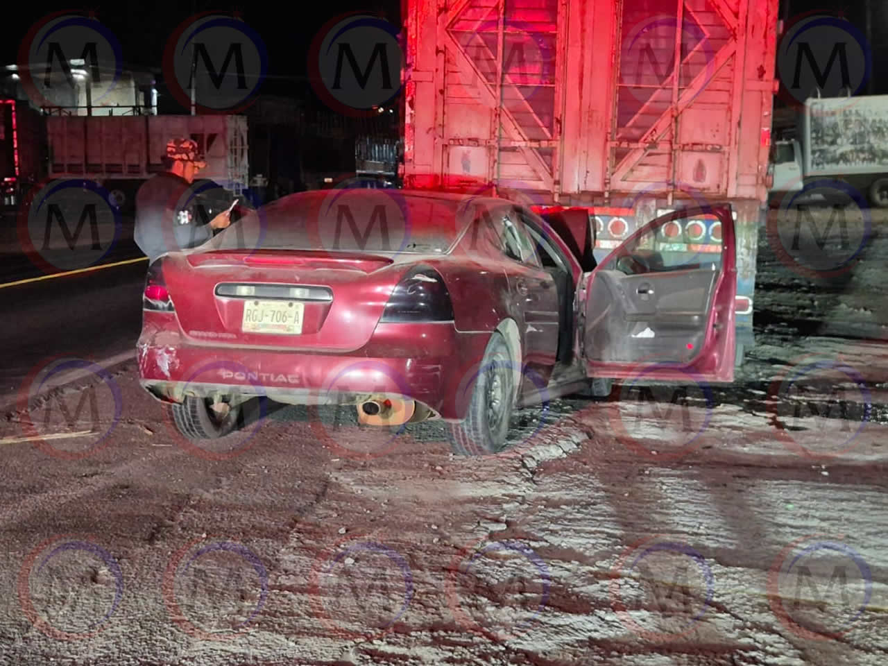 Se trata de un automóvil Pontiac Grand Am color tinto, el cual se impactó contra el remolque de un tráiler que se encontraba estacionado a la orilla de la carretera.