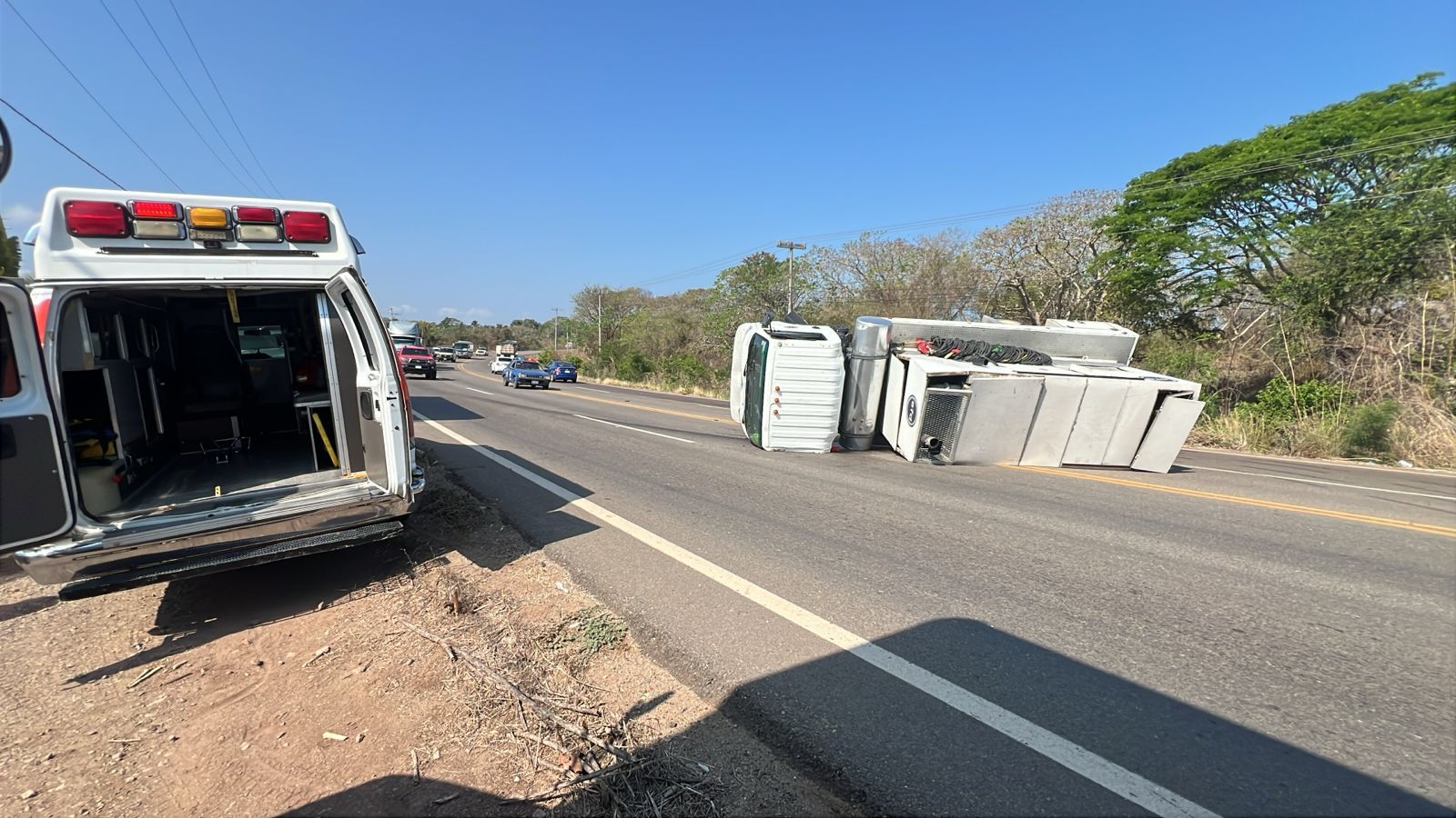Ante este hecho, el reporte fue canalizado inmediatamente a los Bomberos Estatales con sede en la base regional de Rincón de Guayabitos, donde se encontró un tráiler volcado que invadía dos carriles de la cinta asfáltica, con un masculino que se encontraba al interior de la cabina.