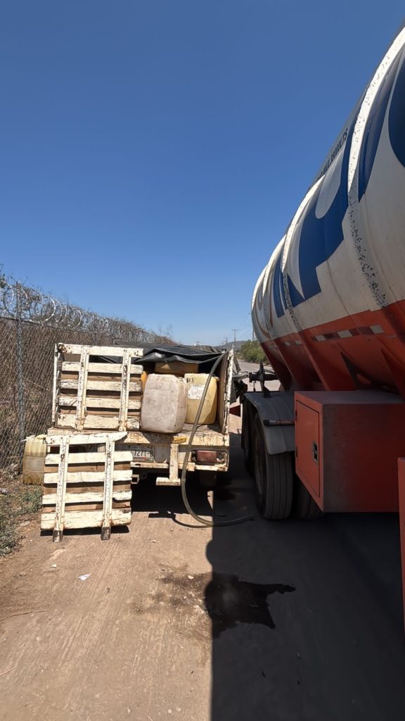 Durante la inspección, también se localizó un vehículo tipo pick up marca Nissan, submarca NP300 Estaquitas, así como tres bidones llenos y 26 vacíos, todos con capacidad de 60 litros, además de una manguera de plástico con adaptador utilizada para la toma de combustible.
